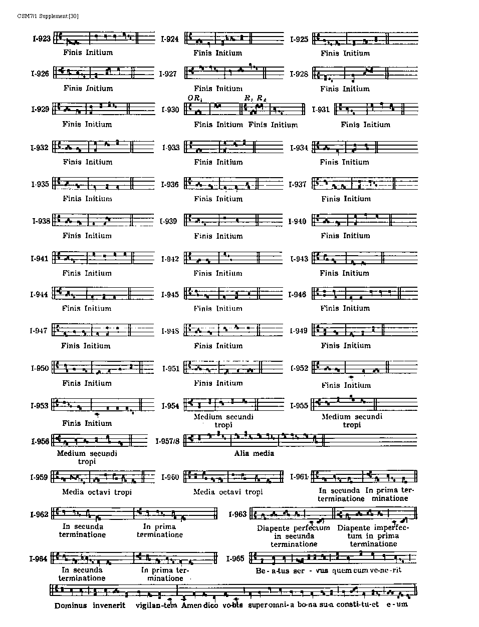 [CSM7/1 Supplement:[30]; text: Finis Initium, Medium secundi tropi, Alia media, Media octavi tropi, In secunda terminatione, In prima terminatione, Diapente perfectum in secunda terminatione, Diapente imperfectum in prima terminatione, Beatus servus quem cum venerit, Dominus invenerit vigilantem, Amen dico vobis super omnia bona sua constituet eum, I-923, I-924, I-925, I-926, I-927, I-928, I-929, I-930, I-931, I-932, I-933, I-934, I-935, I-936, I-937, I-938, I-939, I-940, I-941, I-942, I-943, I-944, I-945, I-946, I-947, I-948, I-949, I-950, I-951, I-952, I-953, I-954, I-955, I-956, I-957, I-958, I-959, I-960, I-961, I-962, I-963, I-964, I-965]