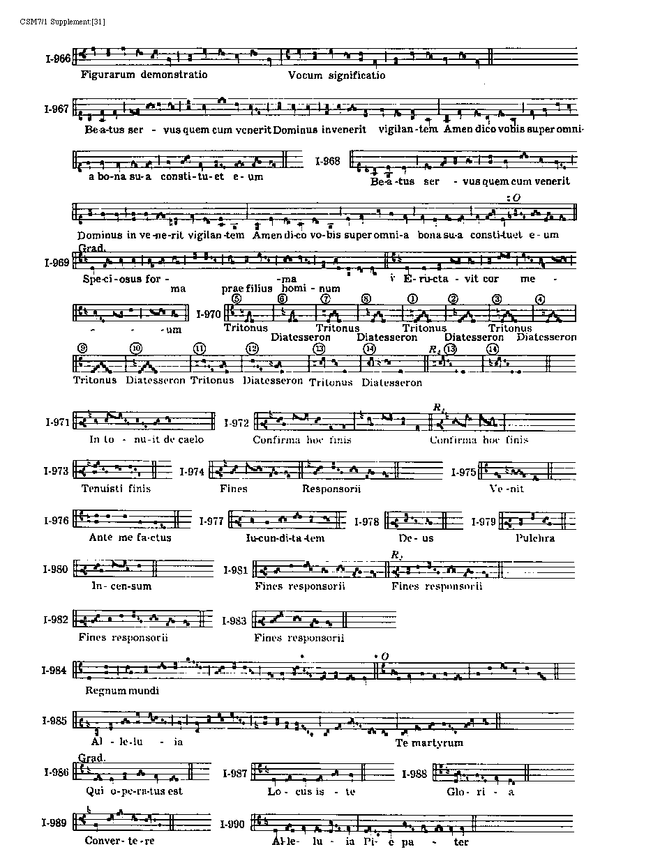 [CSM7/1 Supplement:[31]; text: Figurarum demonstratio, Vocum significatio, Beatus servus quem cum venerit, Dominus invenerit vigilantem, Amen dico vobis super omnia bona sua constituet eum, Graduale, Speciosus forma prae filius hominum Versus Eructavit cor meum, Tritonus, Diatesseron, 1, 2, 3, 4, 5, 6, 7, 8, 9, 10, 11, 12, 13, 14, In tonuit de caelo, Confirma hoc finis, Tenuisti finis, Fines Responsorii, Venit, Ante me factus, Iucunditatem, Deus, Pulchra, Incensum, Regnum mundi, Alleluia Te martyrum, Qui operatus est, Locus iste, Gloria, Convertere, Alleluia Pie pater, I-966, I-967, I-968, I-969, I-970, I-971, I-972, I-973, I-974, I-975, I-976, I-977, I-978, I-979, I-980, I-981, I-982, I-983, I-984, I-985, I-986, I-987, I-988, I-989, I-990, I-991]