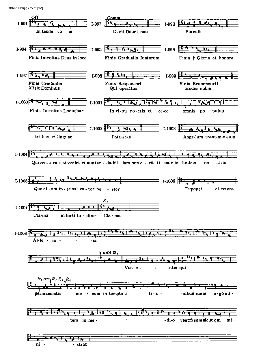 [CSM7/1 Supplement:[32]; text: Offertorium, Intende voci, Communio, Dicit Dominus, Placuit, Finis Introitus Deus in loco, Finis Gradualis Iustorum, Finis Versus Gloria et honore, Finis Gradualis Misit Dominus, Finis Responsorii Qui operatus, Finis Responsorii Hodie nobis, Finis Introitus Loquebar, In visu noctis et ecce omnis populus tribus et linguae, Potestas, Angelum transmiosum, Qui venturus est veniet et non tardabit, Iam non erit timor in finibus nostris, Quoniam ipse salvator noster, Deponet et cetera, Clama in fortitudine, Alleluia Vos estis qui permansistis mecum in temptationibus meis ego autem in medio vestri sum sicut qui ministrat, I-991, I-992, I-993, I-994, I-995, I-996, I-997, I-998, I-999, I-1000, I-1001, I-1002, I-1003, I-1004, I-1005, I-1006, I-1007, I-1008]