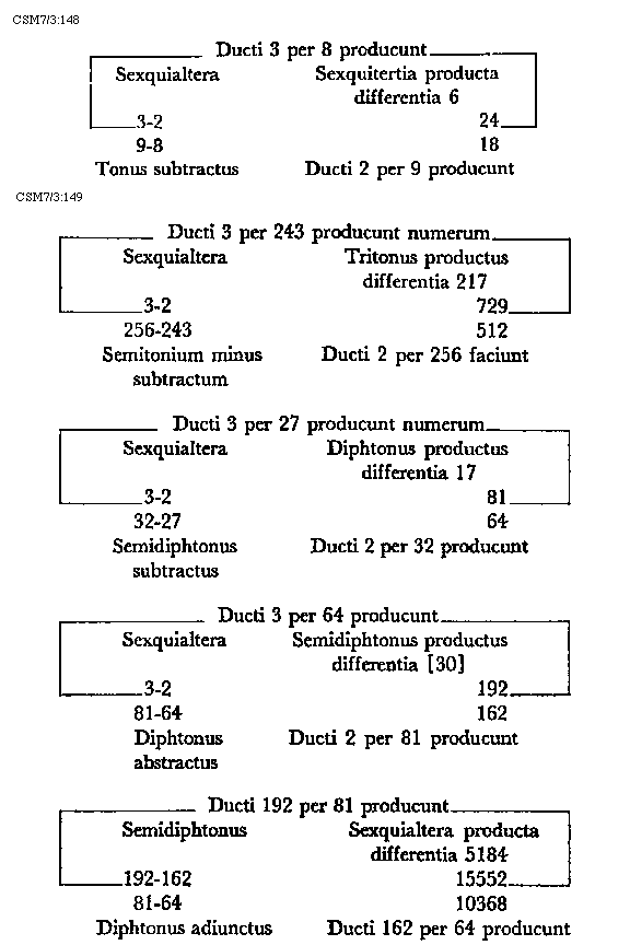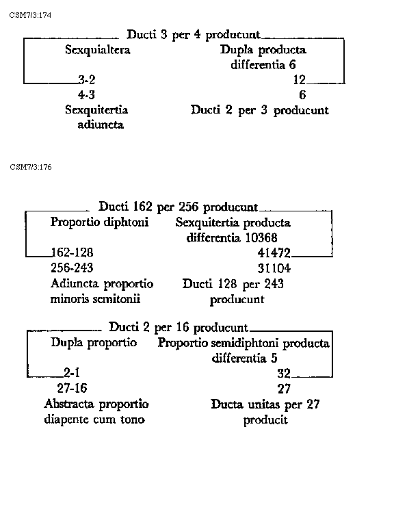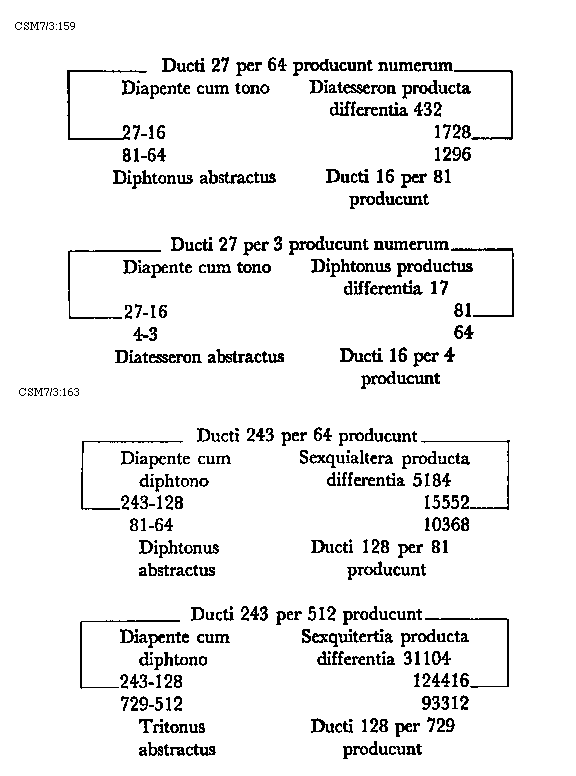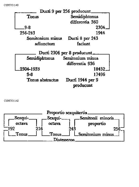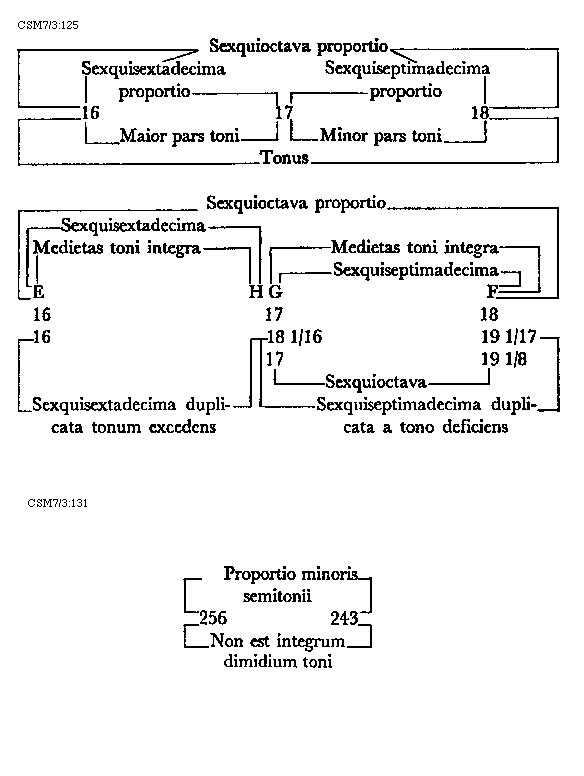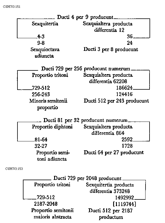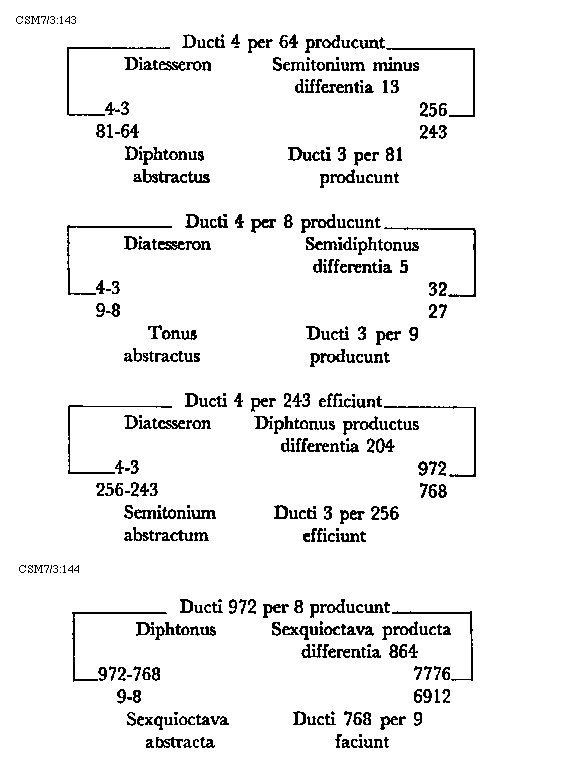 Item tonus sua secundaria divisione dividitur in duo semitonia minora et coma, in numeris autem in bis sex et unitatem. Item tonus tertia sui divisione dividitur vel est divisibilis in quatuor diaschismata et coma. Patet hoc quia tonus est divisibilis in duo semitonia minora et coma. Sed quodlibet semitonium minus dividitur vel est divisibile in duo diaschismata. Semitonium vero maius in duo diaschismata et duo schismata, igitur tonus sui tertia divisione dividitur vel est divisibilis in quatuor