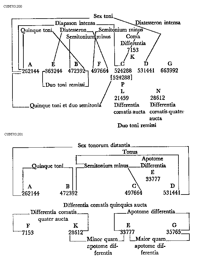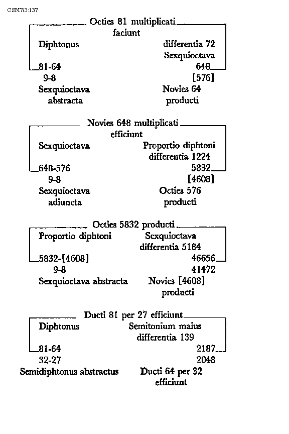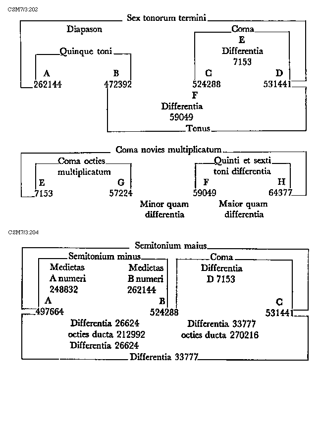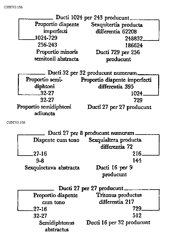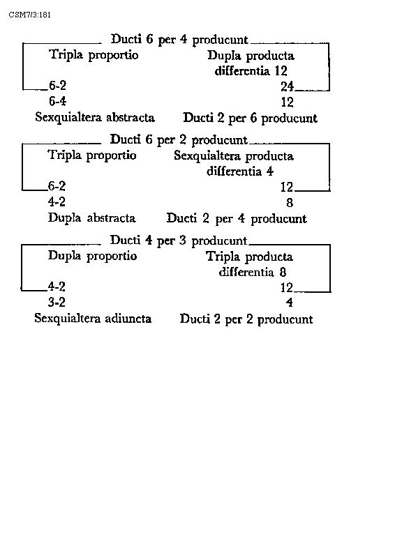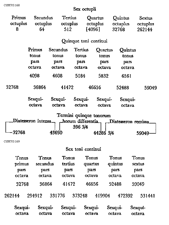Item tonus sua secundaria divisione dividitur in duo semitonia minora et coma, in numeris autem in bis sex et unitatem. Item tonus tertia sui divisione dividitur vel est divisibilis in quatuor diaschismata et coma. Patet hoc quia tonus est divisibilis in duo semitonia minora et coma. Sed quodlibet semitonium minus dividitur vel est divisibile in duo diaschismata. Semitonium vero maius in duo diaschismata et duo schismata, igitur tonus sui tertia divisione dividitur vel est divisibilis in quatuor
