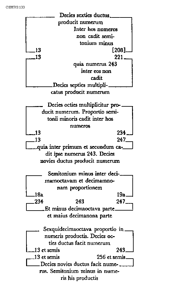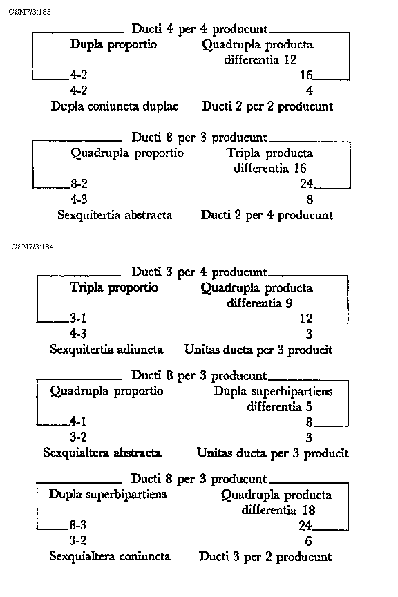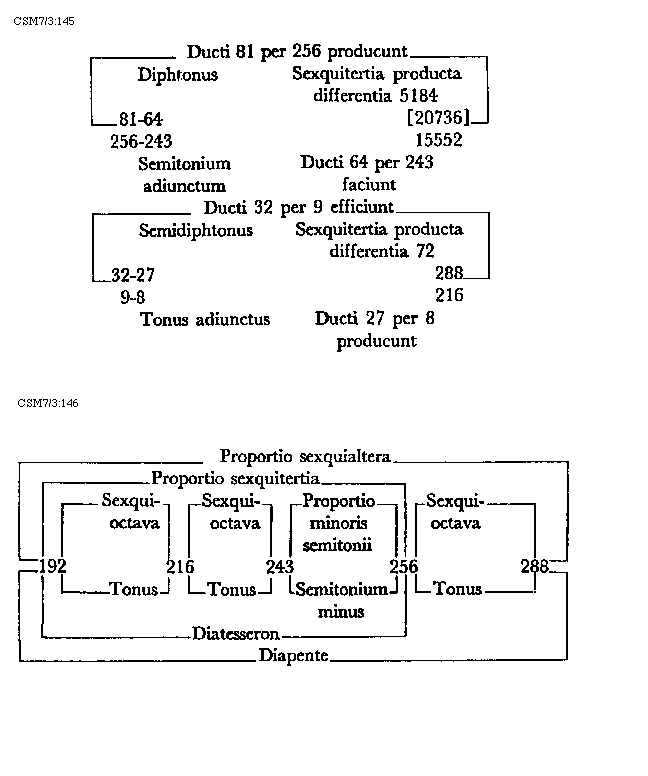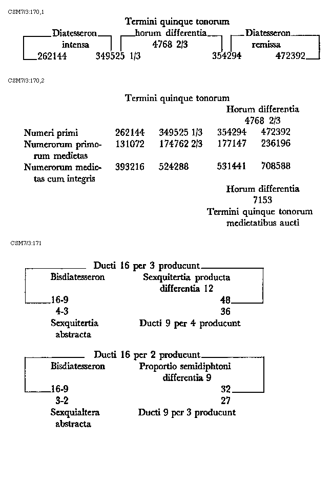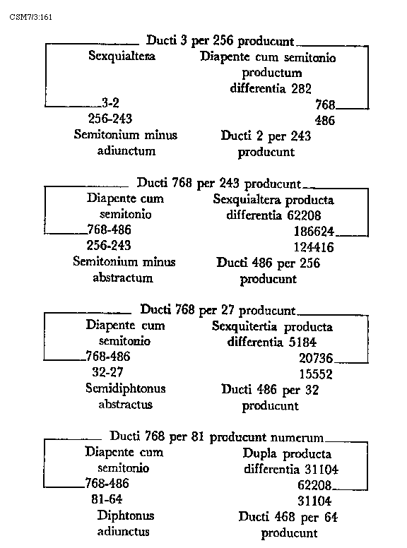 [217]diaschismata et coma. In numeris autem dividitur tonus in quater tria et unitatem sive duas unitatis medietates. Patet hoc quia quod quodlibet diaschisma cum sit medium dieseos sive semitonii minoris valet tres unitates. Coma vero duo valet schismata, quorum quodlibet unitatis medietatem tenet. Hac igitur tertia divisione divisibilis est tonus in quatuor diaschismata valentia 12 unitates et duo schismata valentia unam unitatem sive unius unitatis duas medietates. Semitonium minus vel diesis dividitur vel est divisibile in duo diaschismata. In numeris autem semitonium minus in bis tres dividitur unitates. Semitonium maius sive apotome dividitur vel est divisibile in duo diaschismata et duo schismata. In numeris autem est divisibile semitonium maius in bis tres unitates quoad duo diaschismata et duas unius unitatis medietates quoad duo schismata, quorum quodlibet unitatis dimidium valet. Integrum dimidium toni proprie dividitur vel est divisibile in duo diaschismata et unum schisma. In numeris autem in bis tres unitates et unitatis dimidium quod tenet schisma.