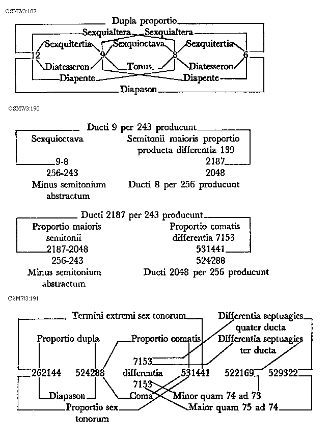 [216]resolvi atque comata quorum divisio etsi ratione comprehenditur actu tamen nec voce humana nec instrumentorum sono unumquodque excepto minore semitonio proferretur, apotome non per se seorsum, sed in toni ratione percipitur. Coma autem, quod ultimum est audibile quo maius semitonium minus excedit, non actu sed sola ratione comprehenditur.