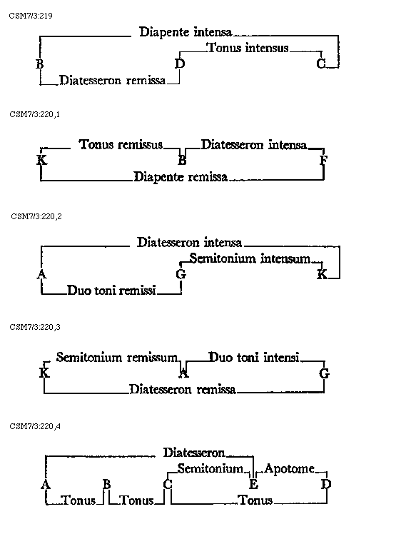 [CSM7/3:220,3; text: Semitonium remissum, Duo toni intensi, K, A, G, Diatesseron remissa]