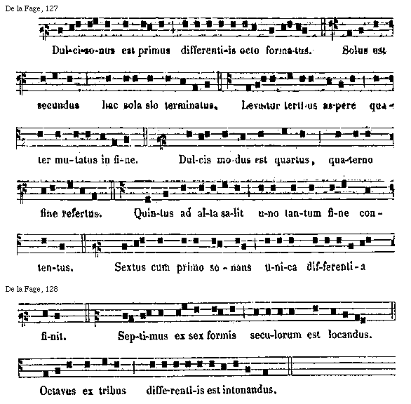 [De La Fage, 127; text: Dulcisonus est primus differentiis octo formatus. Solus est secundus hac sola sic terminatus. Levatur tertius aspere quater mutatus in fine. Dulcis modus est quartus, quaterno fine refertus. Quintus ad alta salit uno tantum fine contentus. Sextus cum primo sonans unica differentia]