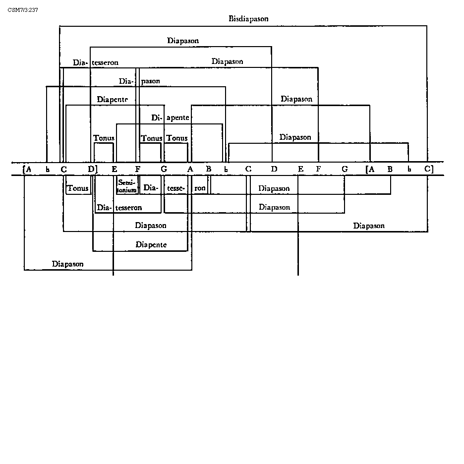 [237][CSM7/3:237; text: Bisdiapason, Diapason, Diatesseron, Diapente, Tonus, Semitonium, A, [sqb], C, D, E, F, G, B]