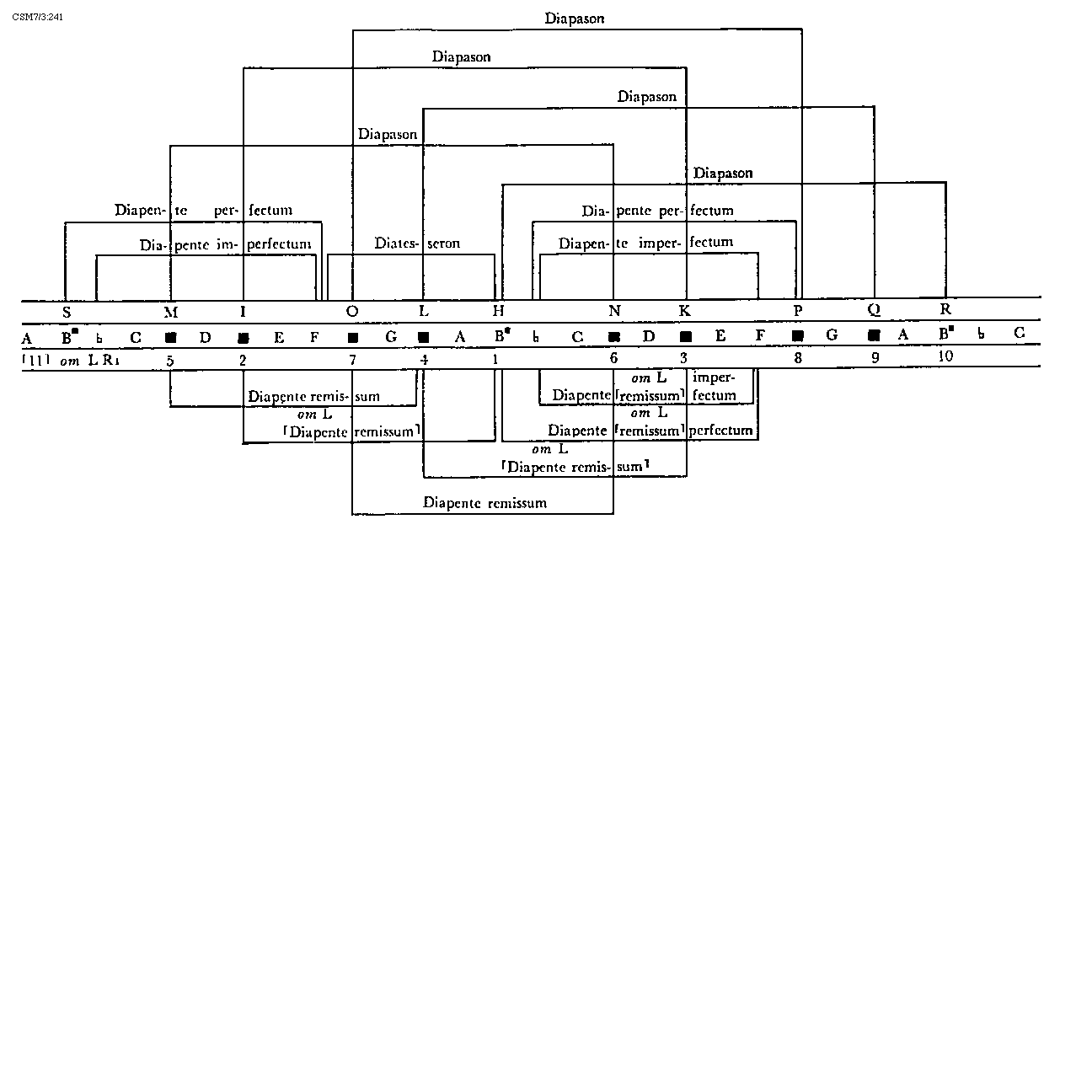 [241][CSM7/3:241; text: Diapason, Diatesseron, Diapente perfectum, Diapente remissum, Diapente remissum imperfectum, Diapente [remissum] imperfectum, Diapente [remissum] perfectum, S, M, I, O, L, H, N, K, P, Q, R, A, B, [sqb], C, D, E, F, G, [11], 5, 2, 7, 4, 1, 6, 3, 8, 9, 10]