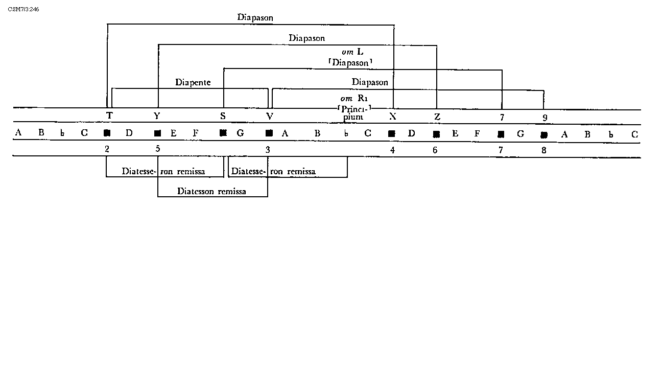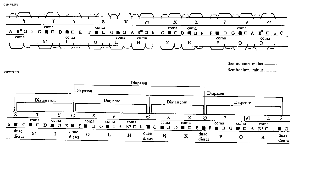 [253][CSM7/3:253; text: Diapason, Diatesseron, Diapente, T, Y, S, V, X, Z, 7, [9], coma, [sqb], C, D, E, F, G, A, B, duae dieses, M, I, O, L, H, N, K, P, Q, R]