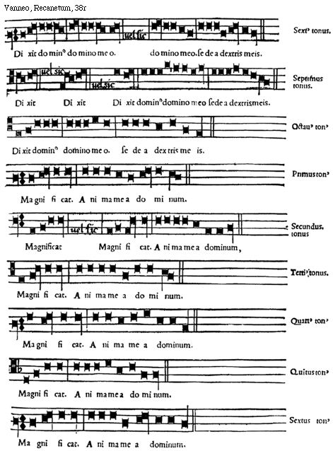 [Primus tonus quibus speciebus constet. in marg.] Primum igitur tonum, neminem uel mediocriter eruditum ignorare puto, prima Diapente specie Re la, et Prima Diatessaron specie Re sol, constare. [Primi toni cadentiae quot et quae. in marg.] Laboranti ergo in huiusmodi toni compositione, in omnibus cantilenae partibus, et in Tenore praesertim, quum sit totius Cantilenae Bassis, ac fundamentum, uagari non licebit extra huius toni supra dictas species, sed intra illarum metas continendum erit, quod si secus feceris, tua erit Cantilena dissona, ac sine Venere, penitusque explodenda, praesertim si Tenor suas desiderauerit Cadentias, quae numero sex sunt Videlicet, C, fa ut, D sol re, F fa ut, G sol re ut, A la mi re, et D la sol re, et has easdem suis in Octauis inuenies, huic utique tono apprime gratas. [Secundi toni species. in marg.] Secundus tonus, instar Primi, eodem et Diapente et Diatessaron potitur, hic tamen ab illo differt dispositione Diatessaron. Nam Primus tonus Diatessaron supra Diapente dispositum habet, hic uero infra Diapente. Caueas igitur ne alterius toni species huic inseras, nisi chimaeram construere cupias. [Secundi toni cadentiae. in marg.] Proprias insuper huius Cadentias sex esse non ignoras, A re, C fa ut, D sol re, F fa ut, G sol re ut, et A la mi re, harumque in Octauis tonus iste Cadentias amat. [Tertii toni species. in marg] Tertii toni compositionem, secunda Diapente species Mi mi, Secundaque Diatessaron species Mi la tibi pariunt, aliae uero penitus alienae sunt, nec faciunt ad rem. [Tertii toni cadentiae. in marg.] Cadentiae autem huic eidem tono propriae ac naturales sex habentur, E la mi, F fa ut, G sol re ut, A la mi re, B fa [sqb] mi, et C sol fa ut, et reliquae quas harum pariunt Octauae. [Quarti toni species. Quarti toni cadentiae. in marg.] Quartus tonus, nisi suum et Diapente et Diatessaron secundum habuerit Mi mi, et La mi, erit auribus insuauis, at seruatis supradictis iugi contextu speciebus, cum suis sex cadentiis, C fa ut, D sol re, E la mi, F fa ut, G sol re ut, et A la mi re, subintellectis harum Octauis, erit omni nectare dulcior. [Quinti toni species. in marg.] Quinto item tono, Diapente et Diatessaron Tertiae speciei uidelicet, Fa fa, et Vt fa congruunt, et non aliae. [Quinti toni cadentiae. in marg.] Cadentiae uero propriae Quattuor sunt uidelicet, F fa ut, G sol re ut, A la mi re, et C sol fa ut, et quae suis in Octauis reperiuntur. [Sexti toni species. Sexti toni cadentiae. in marg.] Sextus autem tonus, easdem habere debet species, quas Quinto attribuimus uidelicet, Fa fa, et Fa ut. Quinque deinde Cadentiis gaudet, C fa ut, D sol re, F fa ut, A la mi re, et C sol fa ut, idem de suis intelligas Octauis. [Septimi toni species. Septimi toni cadentiae. in marg.] Septimus deinde tonus, Diapente quartae tantum speciei Vt sol, et primae speciei Diatessaron Re sol, usurpat, egressus autem harum metas, comtemptui omnibus erit, multoque magis a suis quinque amotus Cadentiis uidelicet, G sol re ut, A la mi re, B fa [sqb] mi, C sol fa ut, et D la sol re, harumque octauis. [Octaui toni species. Octaui toni cadentiae. in marg.] Octauus denique tonus, Septimi toni speciebus fruitur uidelicet, Vt sol, et sol re, suis subeuntibus Cadentiis, quae numero quattuor sunt, D sol re, Fa fa ut, G sol re ut, et C sol fa ut, et totidem harum habent Octauae. Conaberis igitur pro uirili tua, singulis iam praemissis tonis non alias afferre et Diatessaron et Diapente species, et Cadentias nisi eas tantum, quas attribuendas praecepimus inuiolabiliter, nec extra illas in uniuerso Cantilenae context uagandum erit, ut imperiti ac penitus huius artis ignari solent, suis ineptiis iactabundi, qui rebus suis rectius consulerent, si Doctiores audirent.
