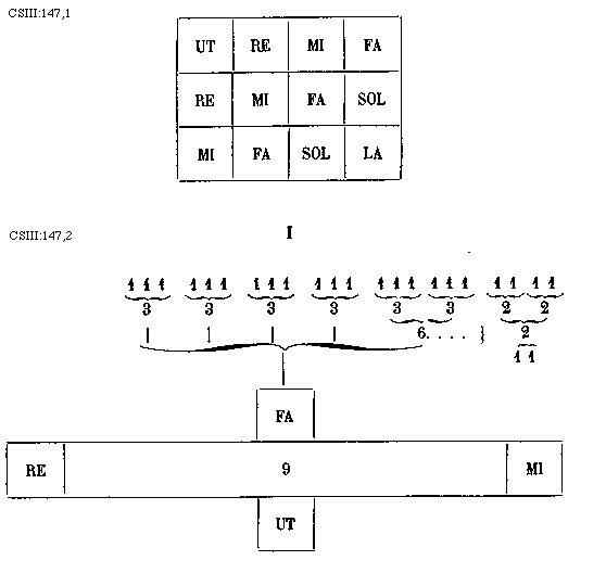 [140]secundum modum perfectum vocatur, et triginta sex athomorum est valoris. Dividi etiam potest predictum tempus in duas equales partes, et tunc prima pars erit minor, secunda vero major, vel e converso, et major pars pro tempore brevi minime imperfectionis improprie, quatuor majoris prolationis computatur, quod non dat respectum ad modum, et viginti quatuor athomorum est valoris. Et minor pars erit semibrevis minor de prolatione majori, que duodecim athomorum est valoris. Et sicut minor semibrevis majoris prolationis ascendit ad divisionem ternariam et quaternariam; et tempus divisionis quaternarie majoris prolationis ascendit ad divisionem senariam et octonariam per punctos athomorum particulariter divisiones aut reductiones predictarum divisionum temporum, per ordinem superius demonstratur.