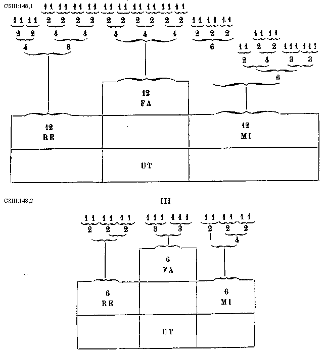 Etiam predictum tempus senarie divisionis, quod est compositum ex duabus majoribus semibrevibus, potest dividi in tres minores. Quare? quia prefatum tempus, ut dictum est, continet in se valorem viginti quatuor athomorum quos possumus dividere in duas partes, videlicet per bis duodecim, sicut dicta divisio senaria potest dividi et reduci per duas majores, et in tres etiam partes, videlicet per ter octo, sicut antedicta divisio senaria in tres semibreves minores potest dividi et reduci. Adhuc supradictum tempus divisionis duodenarie majoris prolationis, quod est compositum ex tribus temporibus divisionis quaternarie majoris etiam prolationis, et quodlibet tempus ex duabus minoribus semibrevibus potest dividi per medium.