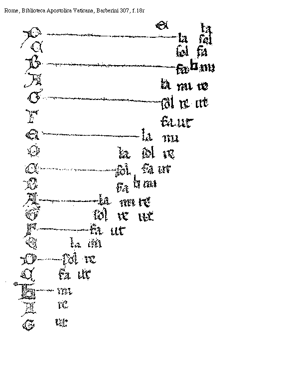[Rome, Biblioteca Apostolica Vaticana, Barberini 307, f.18r; text: G, A, B, C, D, E, F, ut, re, mi, fa ut, sol re, la mi, sol re ut, la mi re, fa [sqb] mi, sol fa ut, la sol re, sol fa, la sol, la]