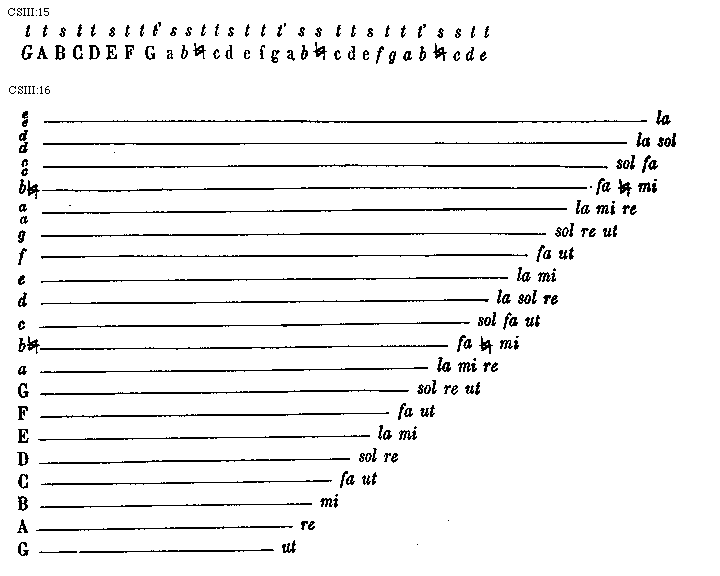 [16][CSIII:16; text: G, A, B, C, D, E, F, a, b, c, d, e, f, g, [sqb], aa, cc, dd, ee, ut, re, mi, fa ut, sol re, la mi, sol re ut, la mi re, fa [sqb] mi, sol fa ut, la sol re, la sol, la]