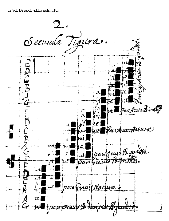 [f.10r][Le Vol, De modo addiscendi, f.10r; text: Secunda Figura. [.2. add. Supra lin.] G, A, B, C, D, E, F, ut, re, mi, fa, sol, la, pars Grauis B. duri, seu B. quadri. Naturae, Mollis, Acuta, Super]