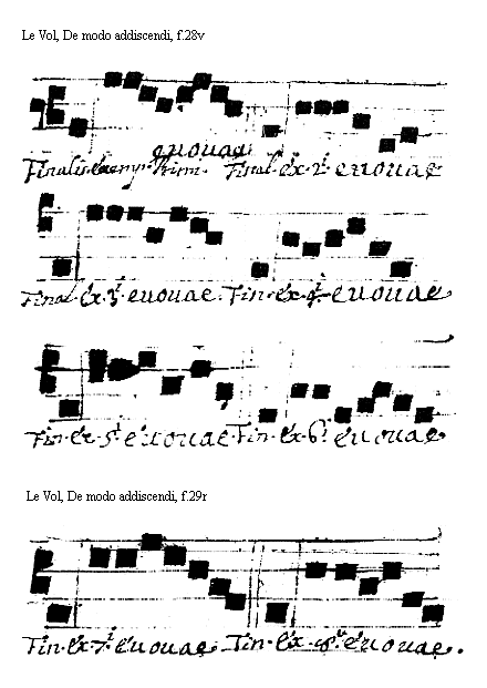 [Le Vol, De modo addiscendi, f.28v; text: Finalis, Exempli Primi. Euouae, Secundi, Tertii, Quarti, Quinti, Sexti]