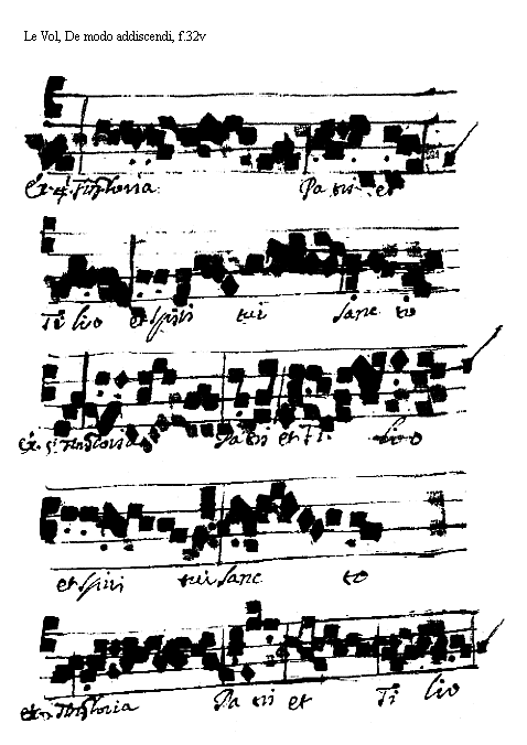 [f.32r][Le Vol, De modo addiscendi, f.32r; text: Exemplum Primi Toni. Finalis. Gloria Parti et Filio et Spiritui Sancto [[Sanc]], Secundi, Tertii]