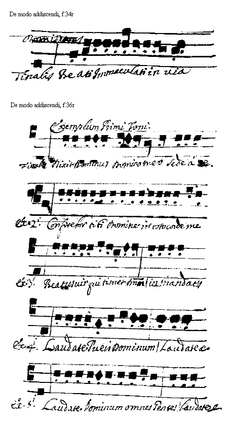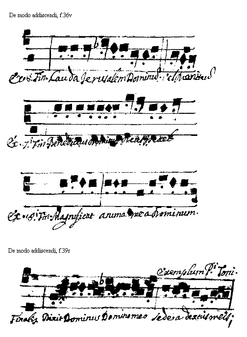 [f.36r][Le Vol, De modo addiscendi, f.36r; text: Exemplum Primi Toni. Finalis, Dixit Dominus Domino meo sede à et caetera, Secundi, Confitebor tibi Domine in toto corde meo. Tertii, beatur uir, qui timet Dominum in mandatis. Quarti, Laudate Pueris Dominum, Quinti, Laudate Dominum omnes Gentes]
