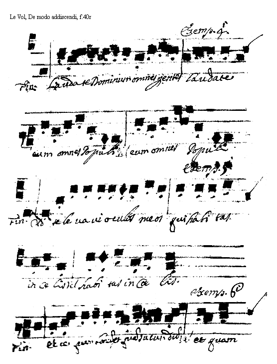 [f.40r][Le Vol, De modo addiscendi, f.40r; text: Exemplum Quarti. Finalis. Dominum omnes gentes eum omnes Populi, Quinti. Ad te leuaui oculos meos qui habitas in caelis. Sexti. Ecce quam bonum, et quam iucundum]