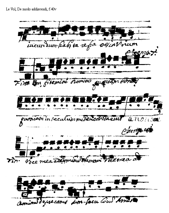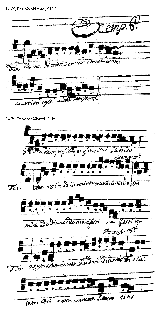 [f.44v][Le Vol, De modo addiscendi, f.44v; text: Exemplum Tertii. Finalis. Iubilate omnis terra Psalmum dicite nomini eius date gloriam laudi eius. Quarti. Attendite popule meus legem meam inclinate aurem uestrum in uerba oris mei Quinti. Confitebimur tibi Deus et]