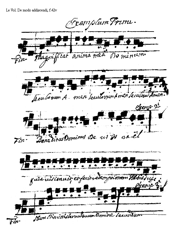 [f.42v][Le Vol, De modo addiscendi, f.42v; text: Exemplum Primi. Finalis. Magnificat anima mea Dominum. Saeculorum Amen. Secundi. Benedictus Dominus Deus Israel quia uisitauit, et fecit redemptionem Plebis suae. Tertii. Nunc Dimittis seruum tuum Domine secundum]