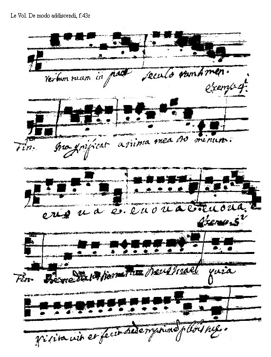 [f.43r][Le Vol, De modo addiscendi, f.43r; text: verbum tuum in pace seculorum Amen. Exemplum Quarti. Finalis. Magnificat anima mea Dominum. euouae. Quinti. Benedictus Dominus Deus Israel quia uisitauit, et fecit redemptionem Plebis suae.]