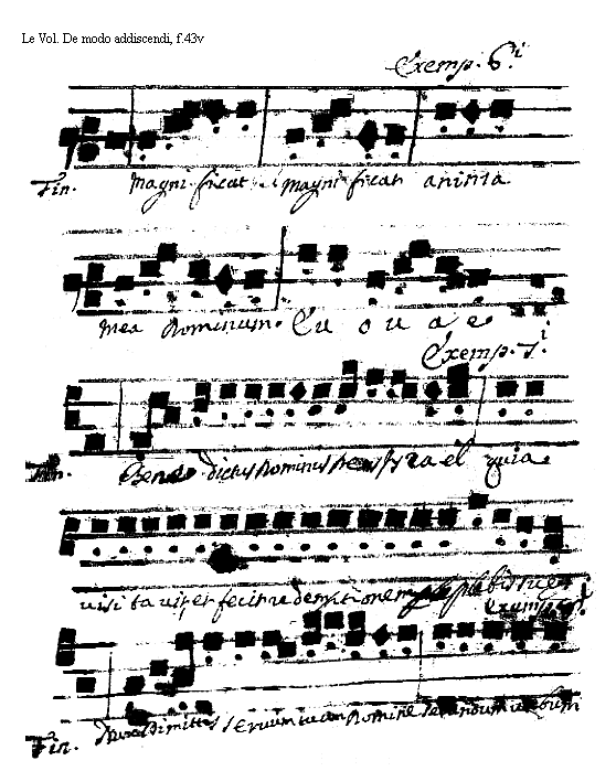 [f.43v][Le Vol, De modo addiscendi, f.43v; text: Exemplum Sexti. Magnificat anima mea Dominum. euouae. Septimi. Benedictus Dominus Deus Israel quia uisitauit, et fecit redemptionem Plebis suae. Finalis. Octaui. Nunc Dimittis seruum tuum Domine secundum uerbum]