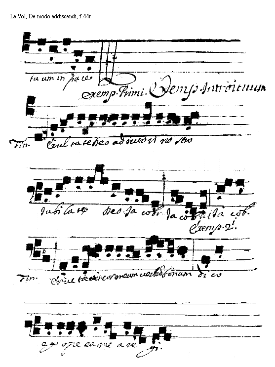 [f.44r][Le Vol, De modo addiscendi, f.44r; text: Exemplum Primi. Finalis. Exempla Introituum, Exultate Deo adiutori nostro, Iubilate Deo Jacobi, Secundi. Eructauit cor meum uerbum bonum dico ego opera mea regi.]