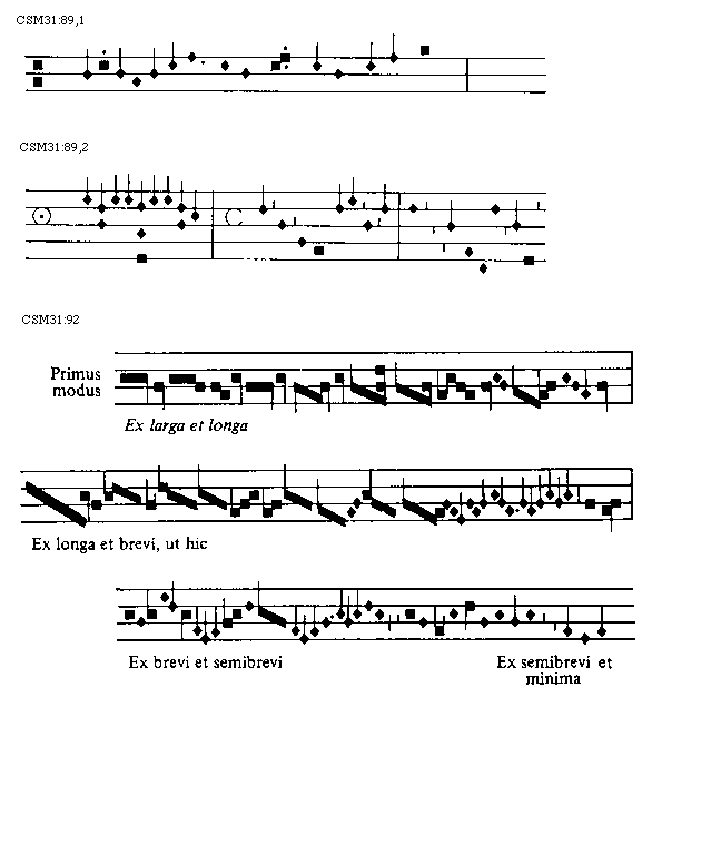 [CSM31:92; text: Primus modus, Ex larga et longa, Ex longa et brevi, ut hic, Ex brevi et semibrevi, Ex semibrevi et minima]