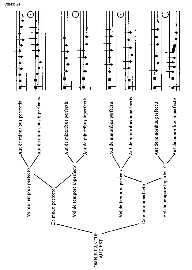 [91][CSM31:91; text: OMNIS CANTUS AUT EST, De modo perfecto, Vel de tempore perfecto, Aut de minoribus perfectis, Aut de minoribus inperfectis, Vel de tempore inperfecto, De modo inperfecto]