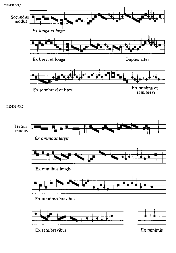 [93][CSM31:93,1; text: Secundus modus, Ex longa et larga, Ex brevi et longa, Duplex alter, Ex semibrevi et brevi, Ex minima et semibrevi]