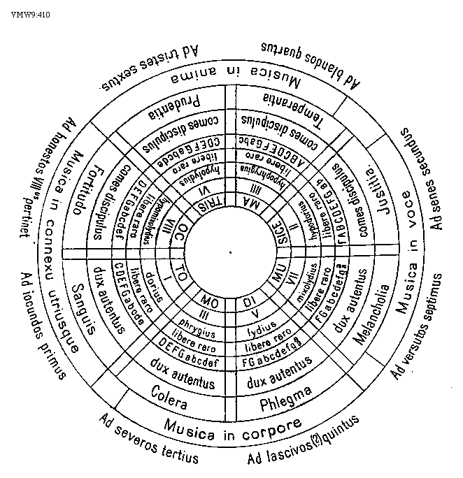 [410][VMW9:410; text: Ad iocundos primus, Ad severos tertius, Ad lascivos (?) quintus, Ad versutos septimus, Ad senes secundus, Ad blandos quartus, Ad tristes sextus. Ad honestos octavus pertinet, Musica in connexu utriusque, Musica in corpore, Musica in voce, Musica in anima, Fortitudo, Sanguis, Colera, Phlegma, Melancholia, Justitia. Temperantia, Prudentia, comes discipulus, dux autentus, [Gamma], A, B, C, D, E, F, G, a, b, c, d, e, f, g, aa, [rob], libere raro, hypomixolydius, dorius, phrygius, lydius, mixolydius, hypodorius, hypophrygius, hypolydius, I, II, III, IIII, V, VI, VII, VIII, Octo modi musice matris]