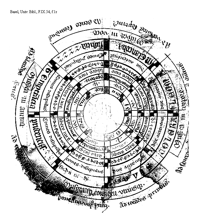 [f.1r][Basel, Univ. Bibl., F.IX.54, f.1r; text: Ad iocundos primus. Ad seueros s[ecundus]. [Ad lasciuos(?)] quintus. Ad versutos septimus. Ad senes secundus. Ad blandos quartus. Ad tristes sextus, [Ad] honestos octauus pertinet. Musyca in connexu vtriusque. Musyca in corpore. Musyca in voce. Musyca in anima. SANGVIS. COLERA. FLEGMA. MElancolia. Iusticia. TEmperancia. prudencia. fordtitudo. dux autentus. Comes discipulus. comes discipulus. [Gamma]. a. b. c. d. e. f. g. aa. cc. dd. libere rare. dorius. frigius. lydius. mixolidius. ypodori. ypofrigius. ypolidius. ypomixolidius. .i. .iii. .v. .vii. .ii. .iiii. .vi. .viii. OCTO modi Musice matris.]