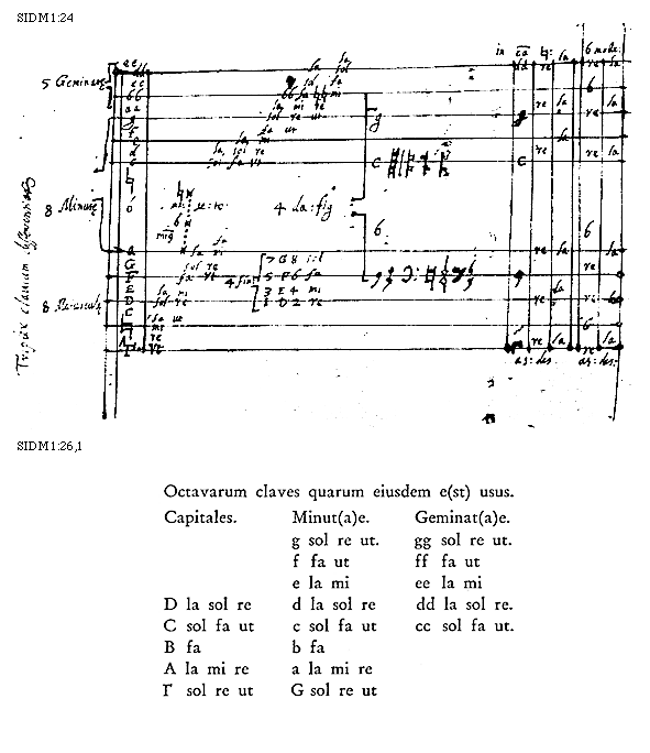 [SIDM1:24; text: Triplex clauium differenciae, 5 Geminate, 8 Minute, 8 Maiuscule, [Gamma], A, [sqb], C, D, E, F, G, a, [rob], c, d, e, f, g, aa, [rob][rob], cc, dd, ee, vt, re, mi, fa ut, sol re, la mi, sol fa vt, la sol re, la mi re, [rob][rob] fa [sqb][sqb] mi, sol fa, la sol, 4 fines, 4 clauium figurae, mode, ascendum, descendum]