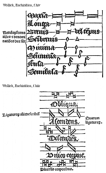 [Wollick, Enchiridion, f.hiv; text: Maxima, Longa, Breuis, vel tempus, Semibreuis, Minima, Semiminima, Fusa, Semifusa, Notularum formationes et denominationes hee sunt]