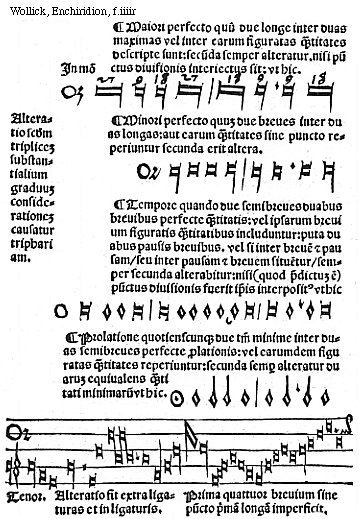 [Wollick, Enchiridion, f.iiiir; text: Alteratio secundum triplicem substantialium graduum considerationem causatur triphariam. In modo, Maiori perfecto quum due longe inter duas maximas vel inter earum figuratas quantitates descripte sunt: secunda semper alteratur. nisi punctus diuisionis interiectus sit: vt hic. 9, 18, 27, Minori perfecto quum due breues inter duas longas: aut earum quantitates sine puncto reperiuntur secunda erit altera. Tempore quando due semibreues duabus breuibus perfecte quantitatis: vel ipsarum breuium figuratis quantitatibus includuntur: puta duabus pausis breuibus. vel si inter breuem et pausam, seu inter pausam et breuem situentur, semper secunda alterabitur: nisi (quod predictum est) punctus diuisionis fuerit ipsis interpositus vt hic, Prolatione quotienscunque due tamen minime inter duas semibreues perfecte prolationis: vel earumdem figuratas quantitates reperiuntur: secunda semper alteratur duarum equiualens quantitati minimarum vt hic. Tenor. Alteratio fit extra ligaturas et in ligaturis. Prima quattuor breuium sine puncto primam longam imperficit]