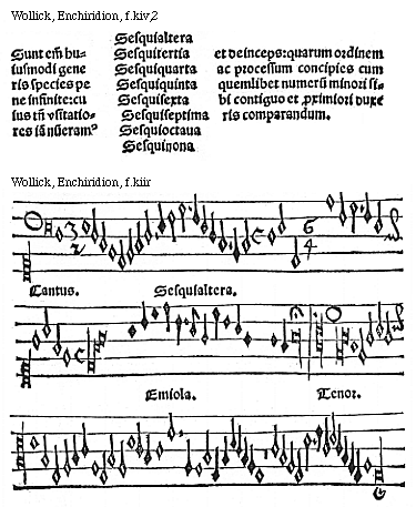 [Wollick, Enchiridion, f.kiv,2; text: Sunt enim huiusmodi generis species pene infinite: cuius tamen vsitatiores iam numeramus, Sesquialtera, Sesquitertia, Sesquiquarta, Sesquiquinta, Sesquisexta, Sesquiseptima, Sesquioctaua, Sesquinona, et deinceps: quarum ordinem ac processum concipies cum quemlibet numerum minori sibi contiguo ex proximiori duxeris comparandum]